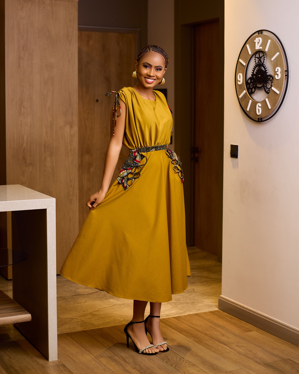 Soft flared midi with delicate shoulder strings and wax-print detailing. Pockets included. Made to order in 3 to 5 business days.