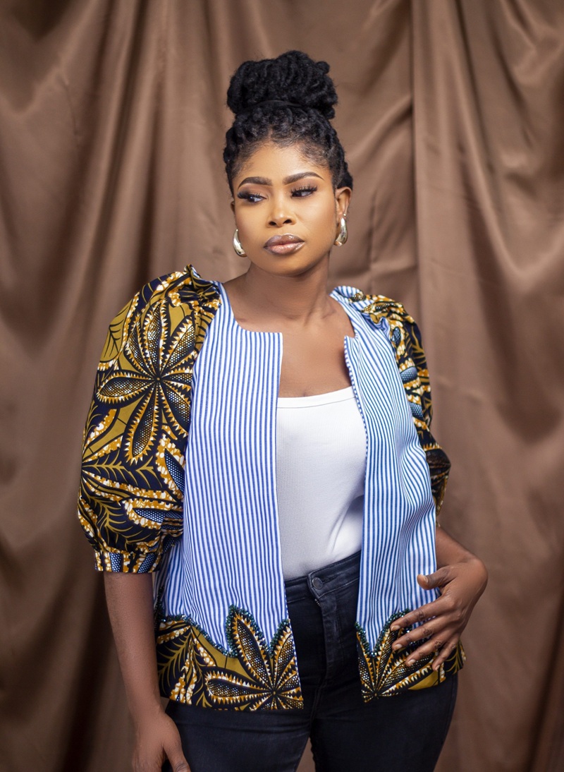 Signature open blazer featuring a striped shell, wax-print paneling, and hand-finished beading. Designed to spark conversation over dresses and separates. International orders ship DDU (Delivered Duty Unpaid); DHL will collect any import duties/taxes from the recipient before delivery.